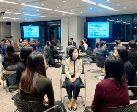 女性社員のキャリア形成支援を目的に、約2,600名の女性役職員全員が参加する社内ネットワークで、ロールモデル紹介を含むダイバーシティ推進室からの情報発信とともに、地域ごとのネットワーキング、キャリア形成について学ぶ対面イベントなどの実施を通じて、社員同士のネットワーキングを広げています。