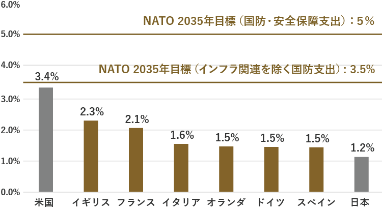 ウクライナ戦争勃発後、米国は巨額の支援を行っていましたが、戦争は長期化。第二次トランプ政権となった米国は欧州諸国に防衛費増額の要求を強く行いました。これを受け、NATO(北大西洋条約機構)は2025年、2035年までに防衛費支出の対GDP比を5%に引き上げる目標を承認。そのため、欧州の防衛関連企業への注目が高まっています。
