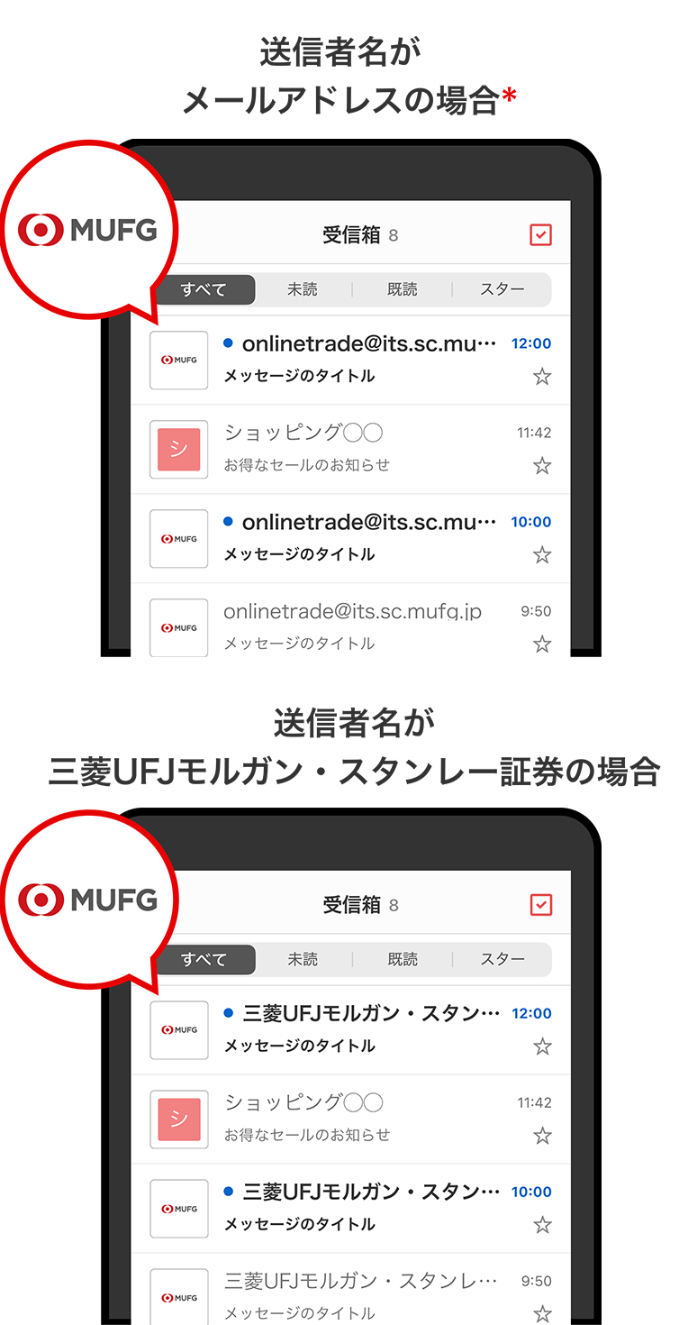 - * 3月23日(月)朝6時以降、its.sc.mufg.jpのドメインから送信されるメールの送信者名表記を「三菱UFJモルガン・スタンレー証券」に変更いたします。