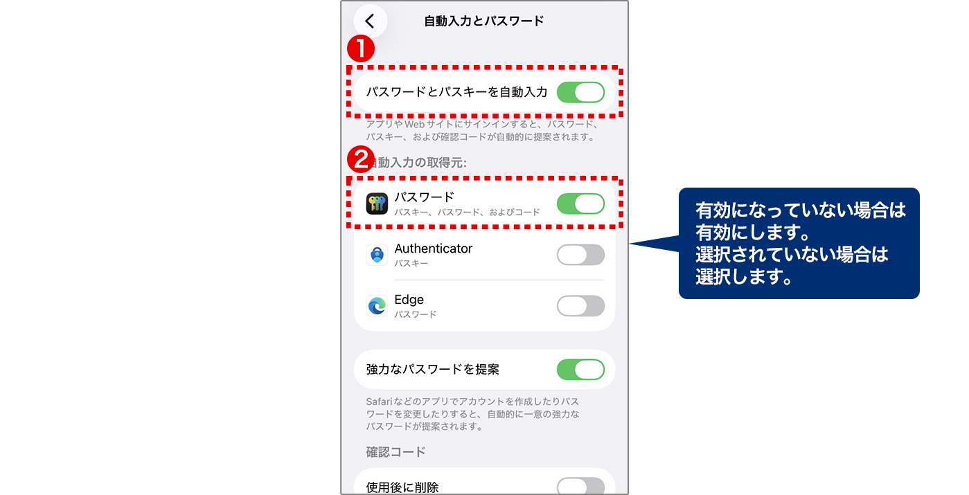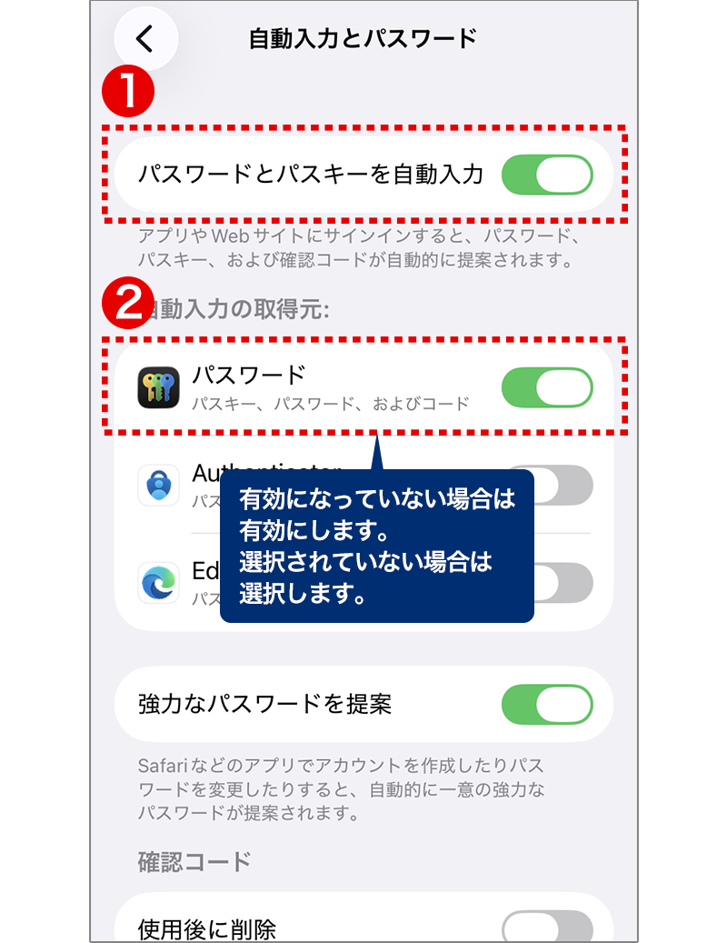 ①「パスワードとパスキーを自動入力」が有効になっていること
