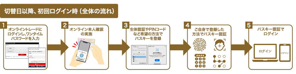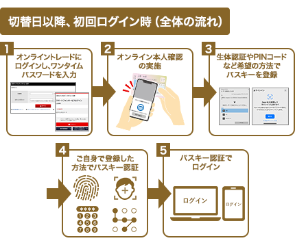 2025年5月26日以降、オンライントレードのログイン時に、メールによるワンタイムパスワードを必須化しておりましたが、日本証券業協会の「インターネット取引における不正アクセス等防止に向けたガイドライン」の改正を受け、2026年2月下旬以降、段階的にパスキー認証への切替えを実施いたします。詳細につきましては、以下をご確認ください。