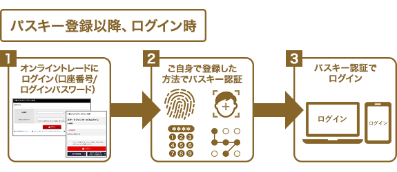 ログイン画面に口座番号およびログインパスワードを入力後、パスキー認証にてログインいただけます。