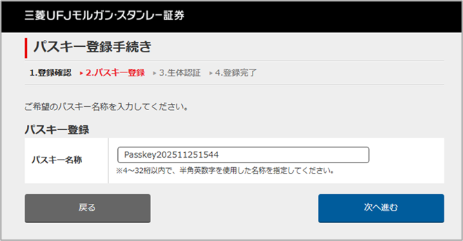 下記ページの「次へ進む」をクリックした先の画面で、エラーコード「MFA08004」が出る場合、「戻る」を押して、下記ページの前のページ「パスキーの登録を実施します。」まで戻り、再度「次へ進む」を押してください。